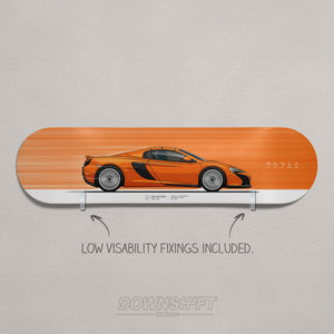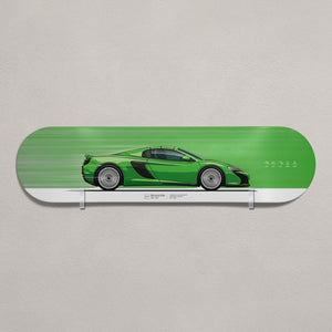Transform your space with our iconic Mclaren 650s Art Deck. Each custom skateboard, crafted from premium 7-ply Canadian maple, showcases your dream car in unparalleled detail. With a high-quality matte laminated finish, these decks elevate the artistry of automotive design to a piece of wall art you'll cherish. Designed for both skating enthusiasts and petrolheads, our decks offer the perfect balance of professional-grade quality and aesthetic brilliance.